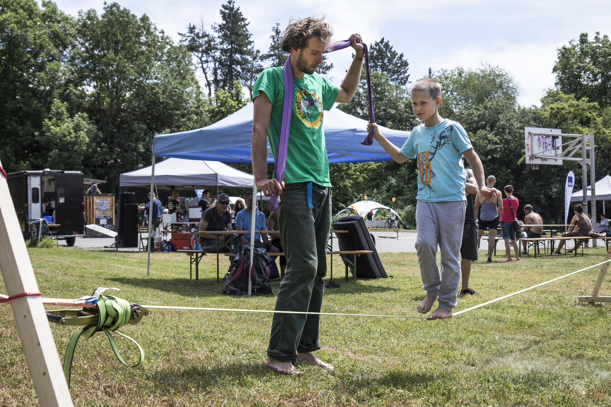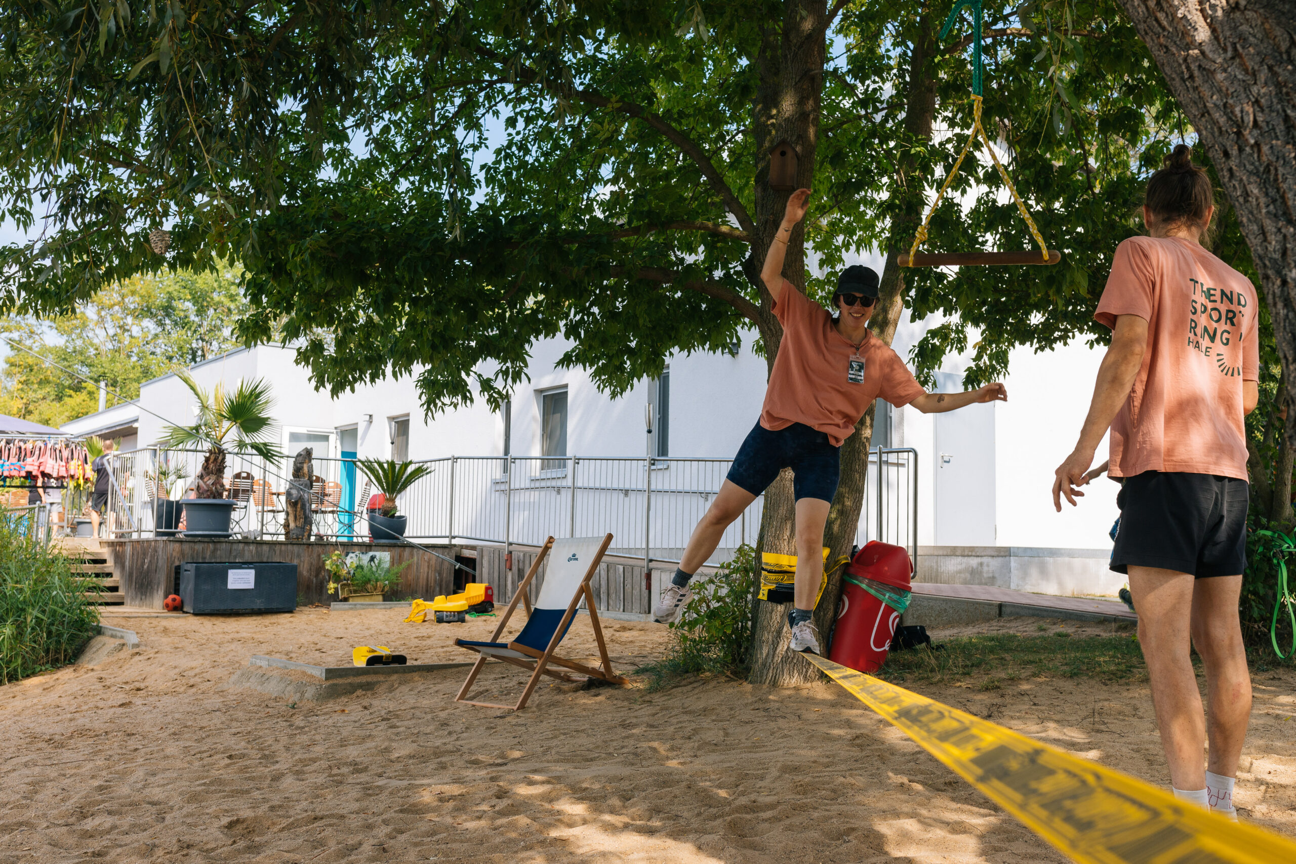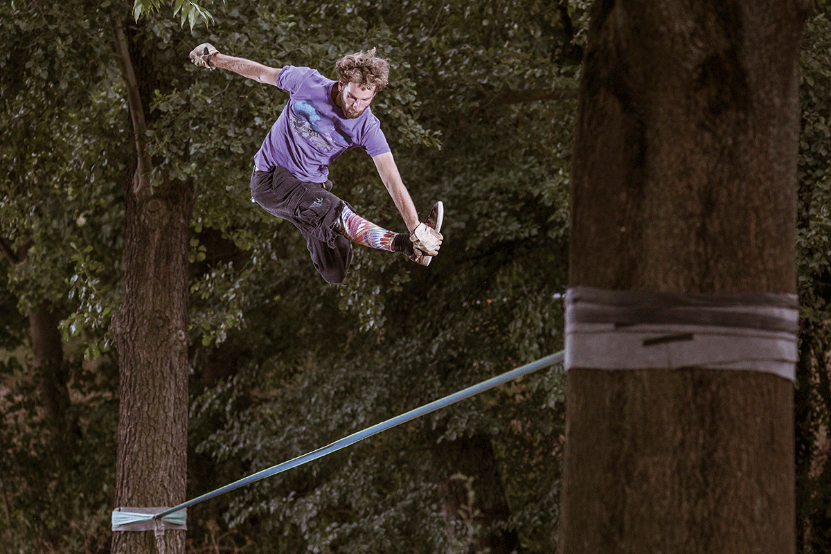 Slacklining beschreibt das Gehen /sich Fortbewegen auf einem Kunststoffband das mit Hilfe von verschiedenen Spannsystemen (z.B. Ratsche, Flaschenzug) zwischen zwei Bäumen oder anderen Anschlagpunkten gespannt wird. Ziel ist es von einem Ende zum anderen zu gelangen und /oder Kunststücke (z.B. Sprünge, Drehungen, Flips) zu vollführen. Dies erfordert von den Sportler*innen ein hohes Maß an Konzentration, Präzision, Körperspannung und Ausdauer, da das Band trotz einer gewissen Grundspannung, beweglich bleibt. Beim Slacklining unterscheidet man u.a. in folgende Kategorien: Einsteiger Slackline, Tricklines, Longlines und Highlines. Jede Kategorie hat ihre eigenen Herausforderungen und Schwierigkeiten. Jeder kann unabhängig von seinem Können, seiner Fitness und Ausdauer das Slacklining ausprobieren, was er/sie möchte. Ob Adrenalin Junkie oder tiefenentspannter Zen-Buddhist, beim Slacklining kommt jeder auf seine Kosten.